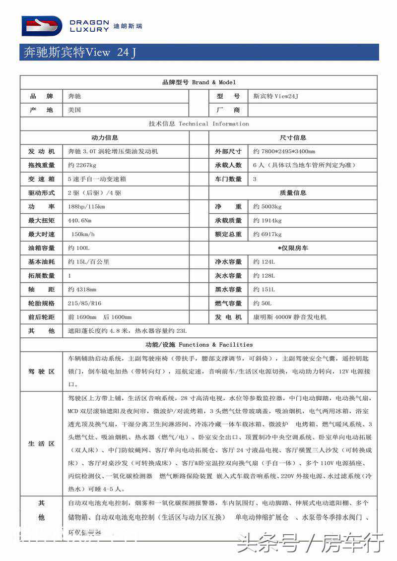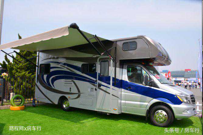 左侧的遮阳棚有一种美式复古的感觉,可伸长约4.8米,遮阳又挡雨,好看又实用。前方的大额头采用流线型的设计,行车阻力小,也增加了稳定性。在动力方面,搭载奔驰3.0T涡轮增压柴油发动机,采用5速手自一体变速箱,最大时速可达150km/h。