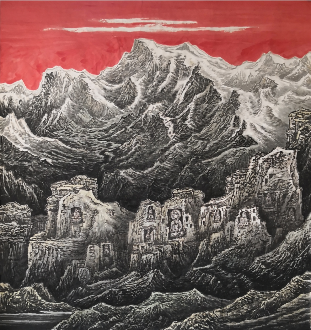 开启西部山水画的三重境界在本土山水画家中,郭文涛和陈天铀的形式风格,或豪迈或沉雄,复活了回荡在西部自然中的金戈铁马之声,这种类似边塞诗风的精神气概,既与西部自然的结构形态和宏大气势相颉颃,也应和了改革开放、高歌猛进的时代氛围,具有强悍的视觉冲击力,为世人所认可和熟知。创作之初,包少茂受其影响和吸引是必然的,所以才有机缘拜陈天铀为师。