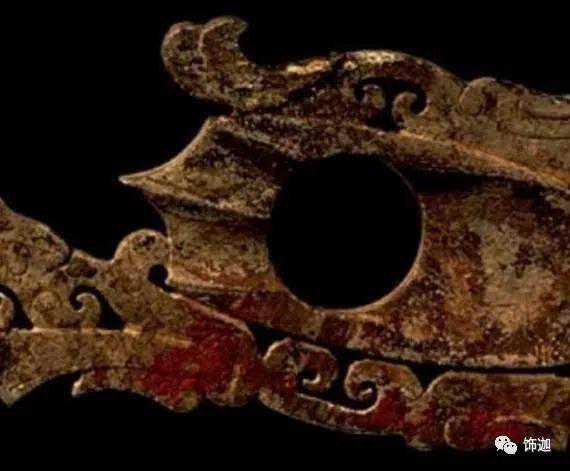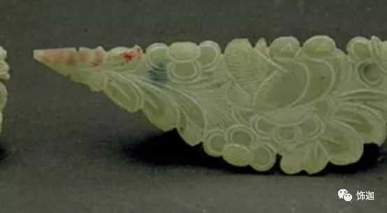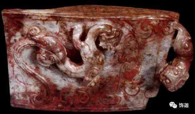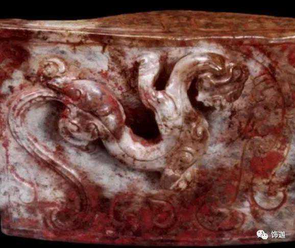 主要受殓葬的朱砂所沁。朱砂沁入玉里的速度很慢,大都附在玉器的纹饰处、镂空等凹陷和粗糙处,将附近的玉皮染红。若将白玉的玉肌沁成深红色,得要1800年左右的时间。