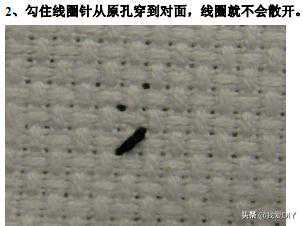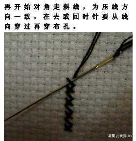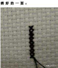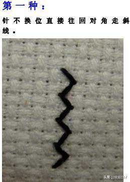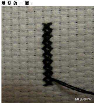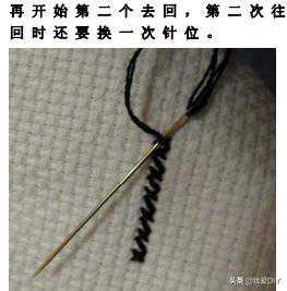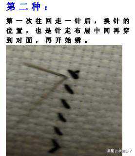 后面的走向方式有两种,第一种:只在绣第二个去回前换一次针位,但第二个去回时有一半针要从线下穿针;第二种:在两次往回走前换两次针位,但只有第一次往回走的最后一针要从线下穿针。