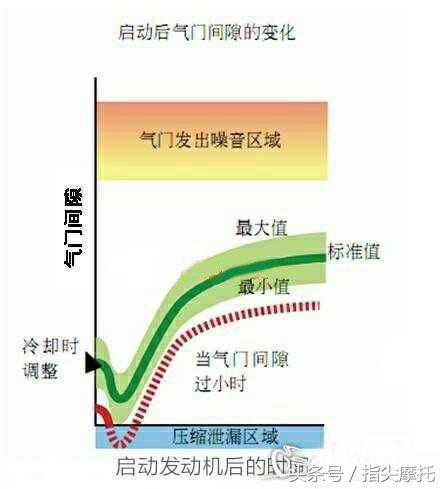 事实果真如此简单吗?为什么不同的师傅会得出截然不同的结论?其实不然,由于摩托车的气缸头和气门的材质不同,即两者的比热容和热膨胀系数不同,导致气门间隙随发动机启动后时间推移的变化是先小后大,如图所示。