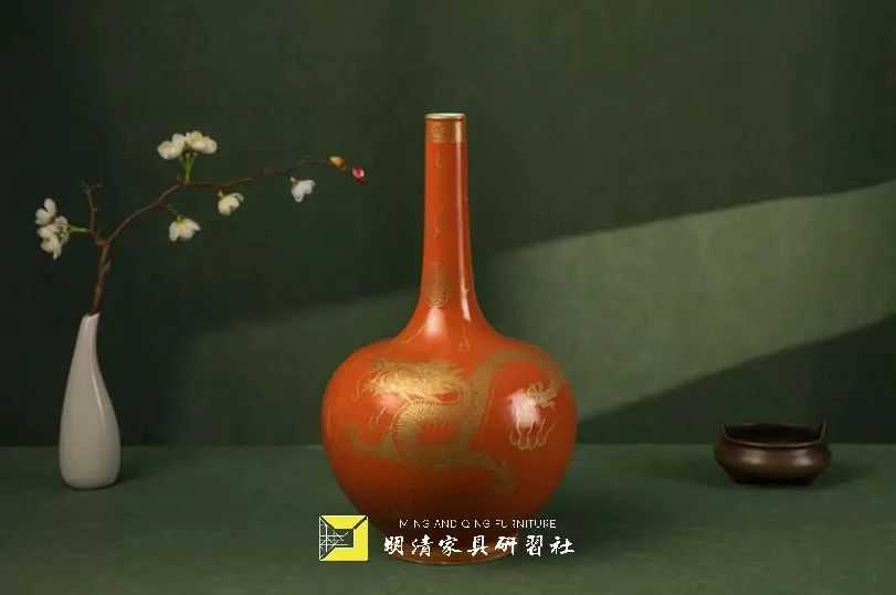清珊瑚红釉描金龙纹长颈瓶研习社藏品