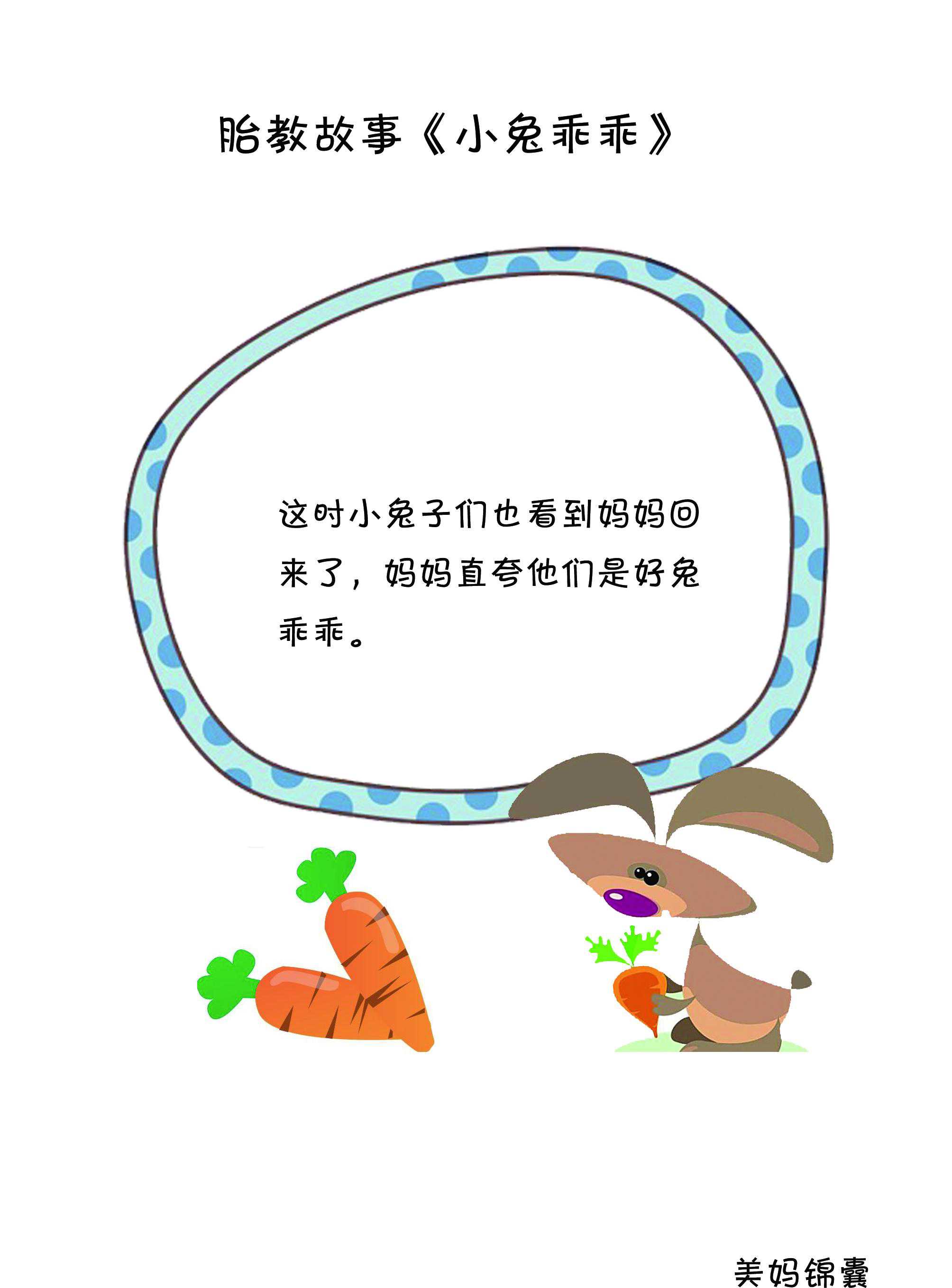 兔妈妈有三个孩子,一个叫红眼睛,一个叫长耳朵,一个叫短尾巴.一天兔妈妈要去拔萝卜,对三个孩子说:"好好看家,不要给陌生人开门!"兔妈妈提着蓝子去树林里拔萝卜了,从树从里走来的大灰狼发现兔妈妈不在家,想把小兔当点心吃!于是来到兔子家门口,但不知如何进去。正在这时兔妈妈回来了,大灰狼赶紧藏了起来。兔妈妈来到门前唱到:"小兔乖乖,把门儿开开,妈妈回来,快把门儿开!"三只小兔一听妈妈回来了,高兴地就把门打开了。