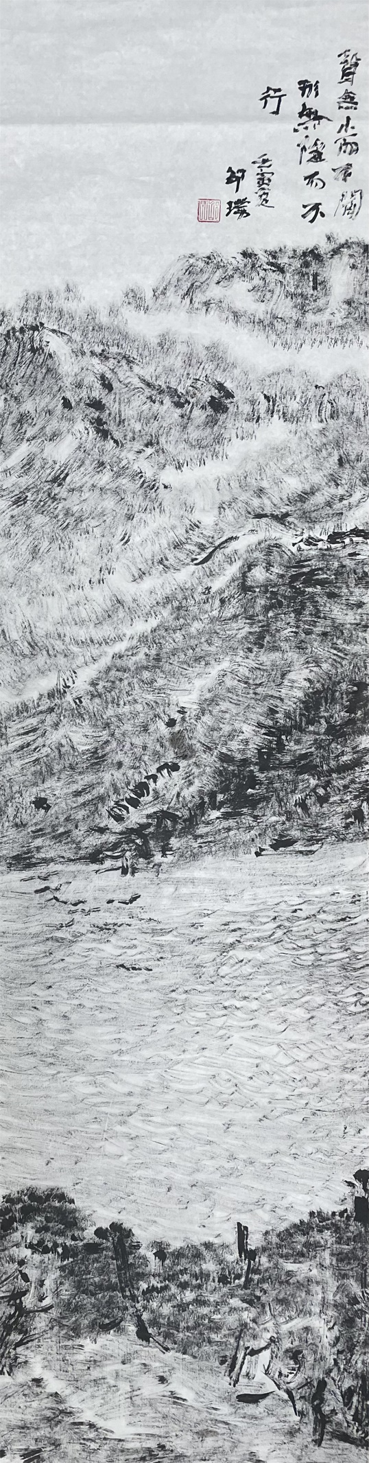 欲造迷人的一片灰,非破前人的用笔习惯而不可得。这是一种大胆、不羁乃至狂傲的尝试,一笔画去,不再是传统的、带中锋或侧锋的一条线,而是齐头并进、粗细不等、井然有序的一个线阵;不再求用笔锋的变化,描画客体的形态与质感,而事以线阵构成的视觉灰,阐释决定客体形状、质感的背后的势和力。此法在传统画法的皴中似曾相识,被邵璞抓在手中,锐意改良,发扬光大,大范围使用,且所涉客体不再限于皴法针对的山石,而是涵盖万千,草木丛林、河池川原、风雨云雾。