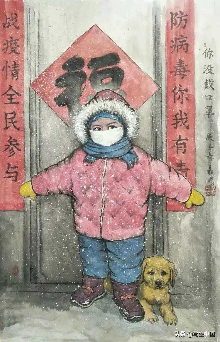 《小门神——你没戴口罩》中国画60x90cm聂鹏