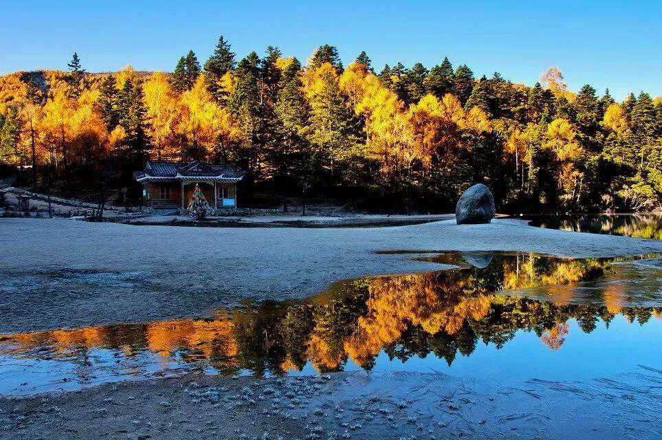 距离康定机场差不多十公里的红海子,也是个为数不多的贡嘎北坡观景平台。在一览无余的蓝天映衬下,雪峰倒映在湖中非常迷人,等再冷一点,湖面结了冰,冰面如镜,更是宛如仙境。