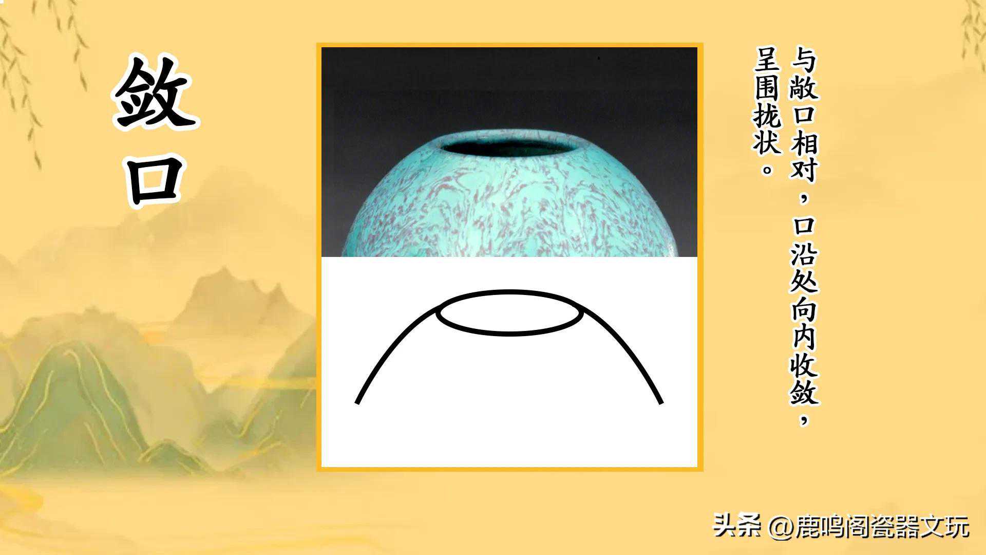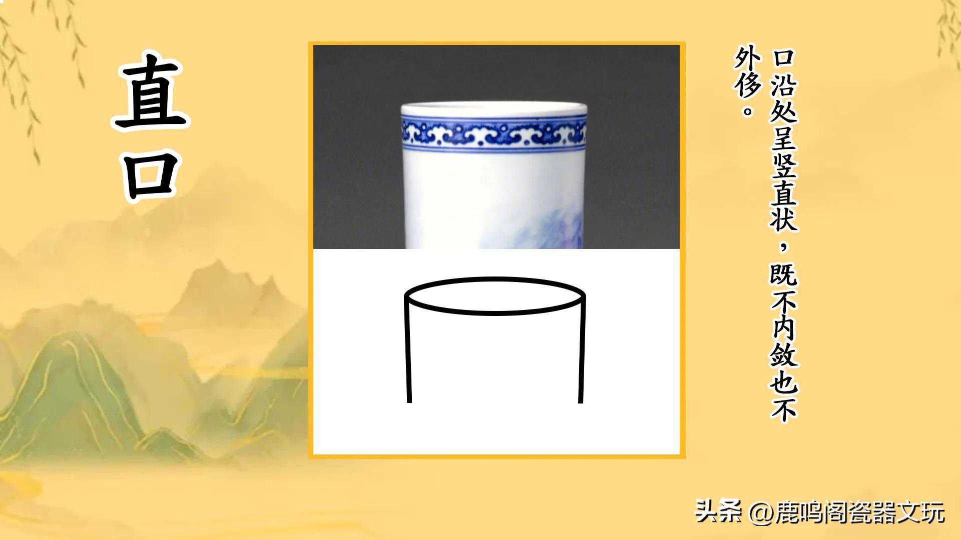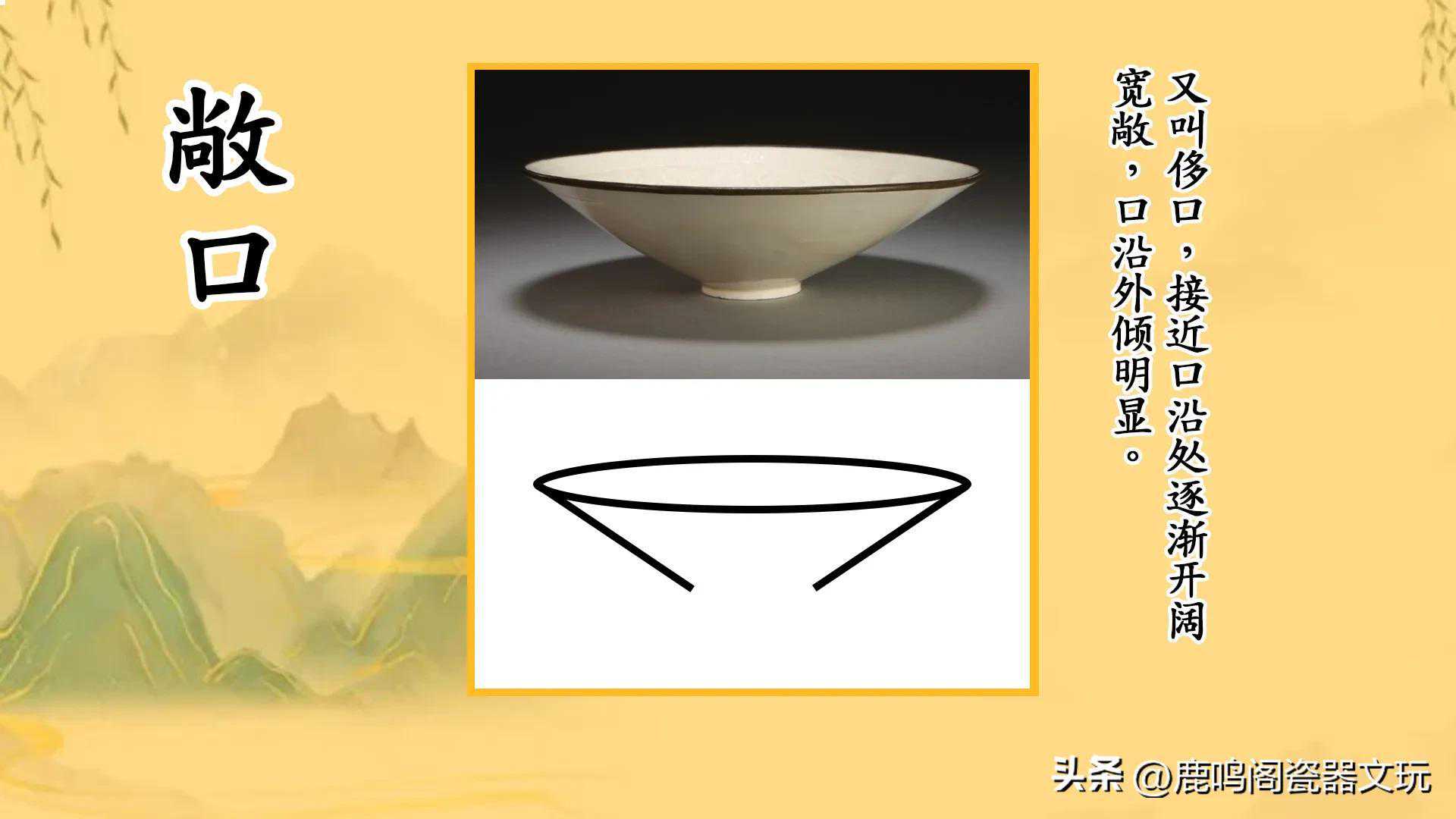 按外形划分,大致可以将瓷器口沿分类为10种,它们是:撇口、敛口、敞口、束口、直口、花口、盘口、洗口、唇口、喇叭口。
